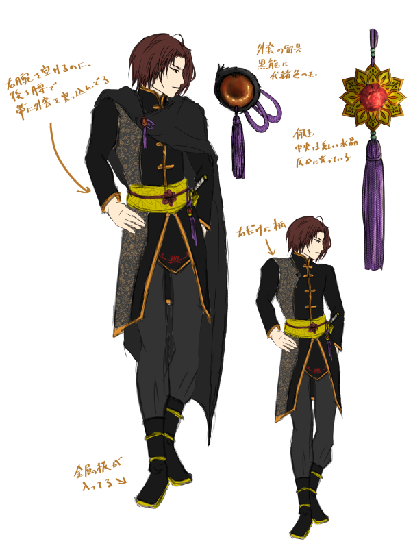- 黒い服・黒い外套・宝剣差し。鎧は余り好まず、軽装なことが多い。